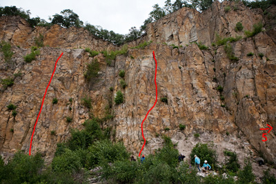 Vielleicht weiß jemand, welche Routen wir da geklettert sind. Weiter rechts an einem Fels steht eine 5. Davon rechts soll die Henkelpfeilerroute sein.