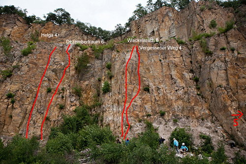 Die Routen, die wir letztens geklettert sind sind wohl die Helga 4+ und der vergessene Weg 4 (Danke an Ralf Nemec). Genau klären werde ich es wohl erst, wenn der neue Kletterführer Odenwald erschienen ist. Es existieren noch zahllose Namen und Ideen, wie die neuen Haken dort in der Wand wohl zu begehen seien. Auch das Update des Kletterführers ist da nicht sehr erhellend.