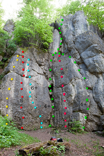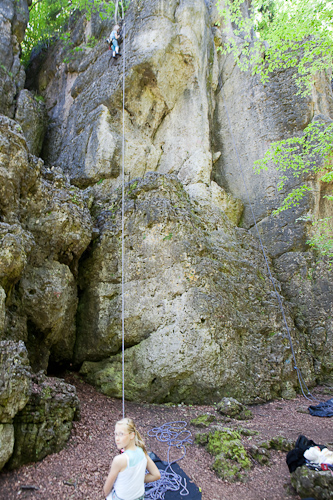 Wir schauen uns noch die Iron Fist 6, Mantlewand 6+ an, entscheiden aber, da mittlerweile auch hier niemand mehr ist, noch einmal zu Leupoldstein zurückzukehren. Offenbar sind alle Urlauber nun auf der Autobahn und nur noch wenige Einheimige am klettern. Da das Wetter schön ist und die Arbeit noch früh genug kommt, bleiben wir auch den Nachmittag in der Fränkischen…
