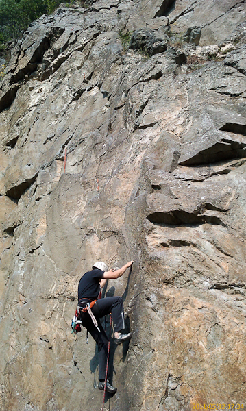 Vor dem breiten Band in 6 Meter Höhe wird es dann kniffelig. Ich finde nicht die richtigen Tritte und bin zu weit links. Erst als ich mich dem Band weiter rechts nähere kann ich den Untergriff (Ein schönes Loch rechts oberhalb des Hakens) fassen. Doch hat mich das viel Kraft gekostet. Über das Band geht es dann sehr einfach und der Rest der Route ist nicht mehr besonders schwer. Wenn man sich ein wenig rechts hält. Am Anfang hatte ich wieder die Tendenz mich links zu halten, dann kommt man fast in den “mittleren Ausstieg”.