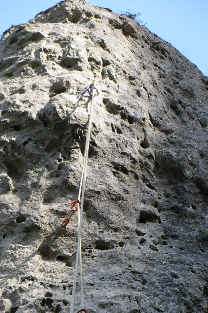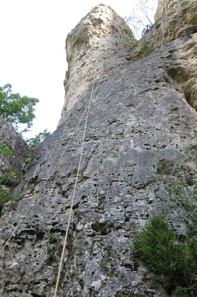 Petit rond – 5b – der Fels erinnert mich sehr stark an die Felsen des Frankejura. Viele kleine Löcher, fette Schuppen, dann wieder glatte Flächen. Da der Umlenker im Überhang ist, muss man sich verdammt anstrengen, um den letzten Griff mit links zu halten und mit rechts einen Karbiner und dann das Seil zu setzen.