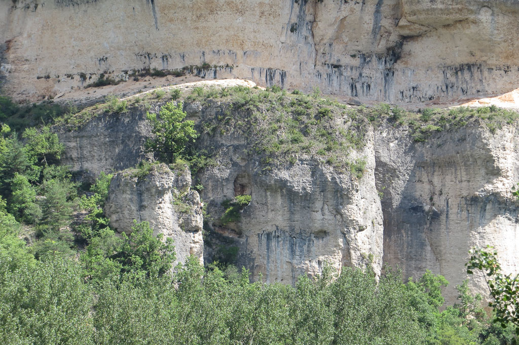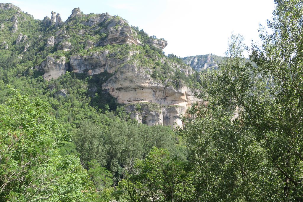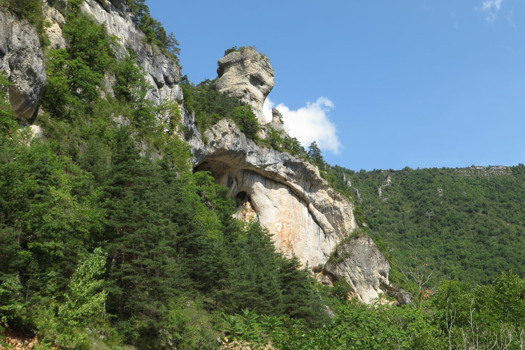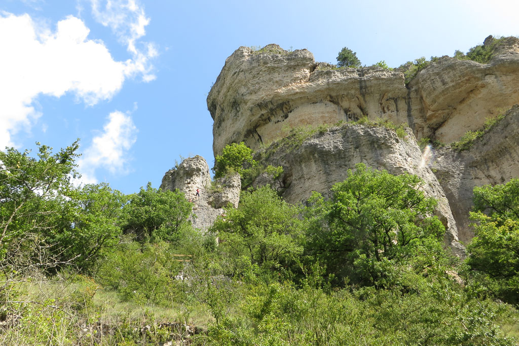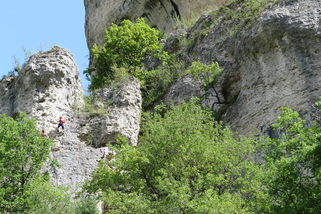 Erstaunlicherweise ist dann die Route nebenan, die Et d’jip eine 5c und lässt sich viel leichter klettern. Man sollte nur nicht stur die Hakenlinie laufen, sondern sich rechts und links die Griffe suchen. Ansonsten wird es unnötig schwer. Einzig in der Mitte kommt ein Meter, der mal etwas härter ist. Am Umlenker dann ein guter Stand und Zeit sich in Ruhe das Tal der Tarn anzuschauen.